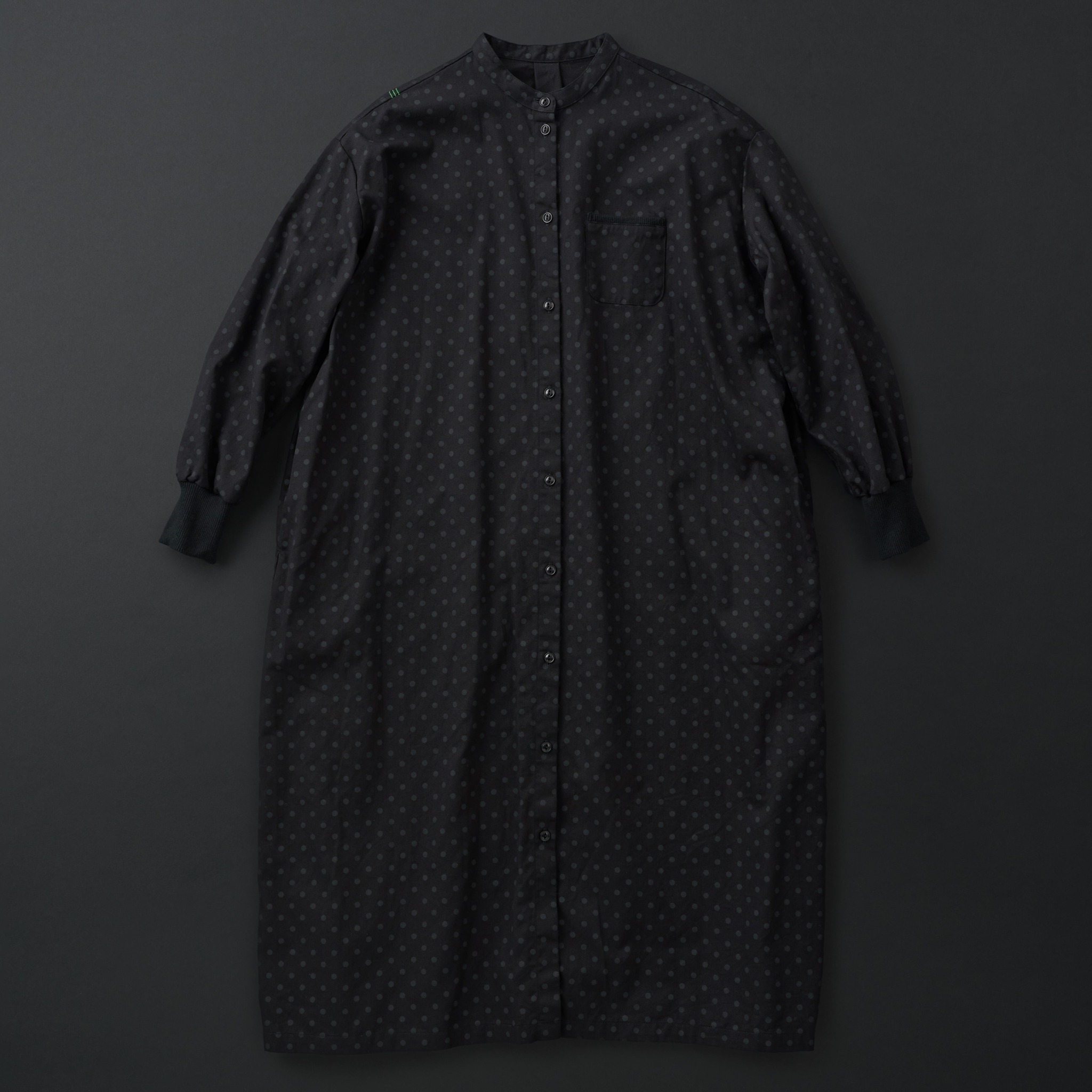 同系色の水玉をプリントした中厚手のツイル生地で仕立てたドロップショルダー型のシンプルなワンピース