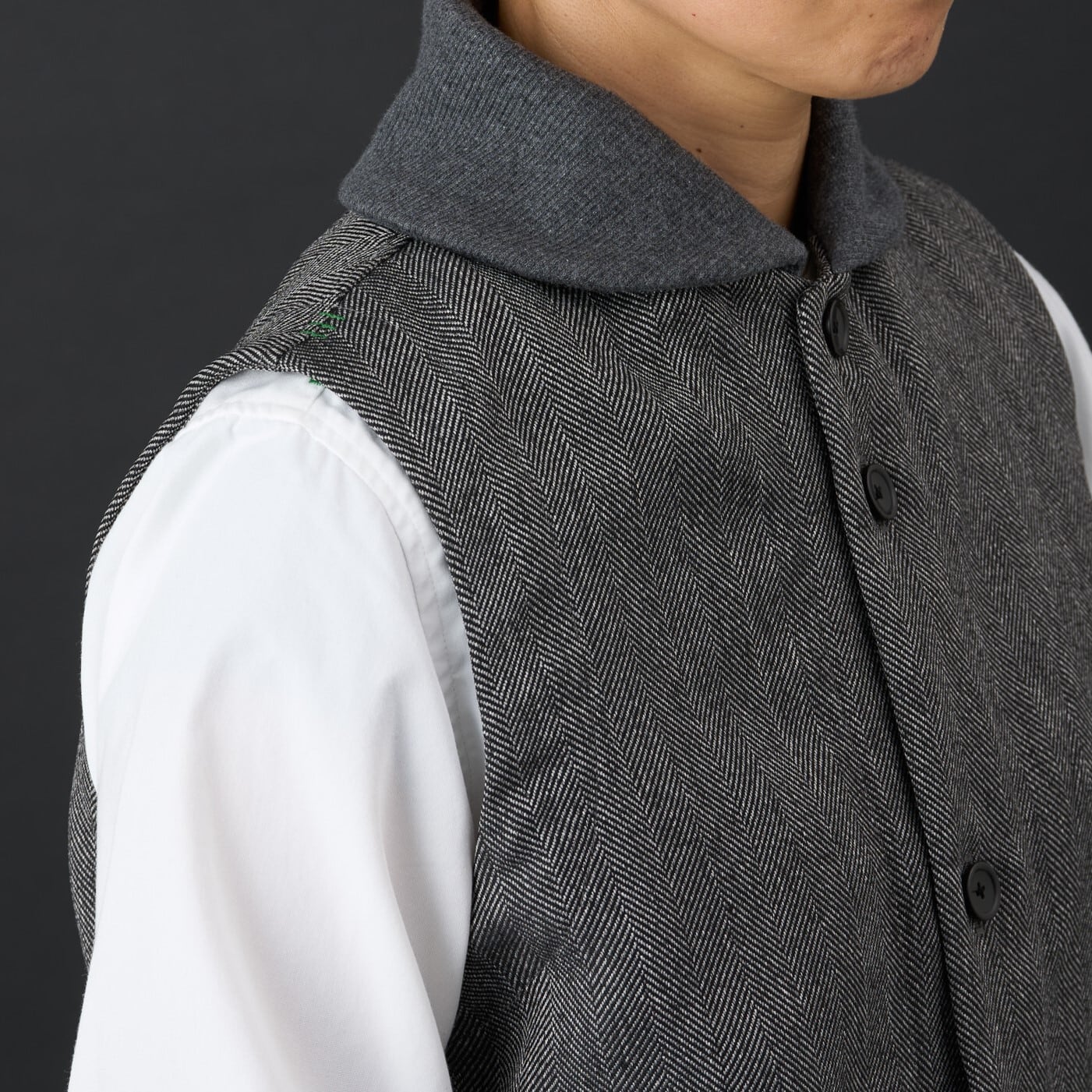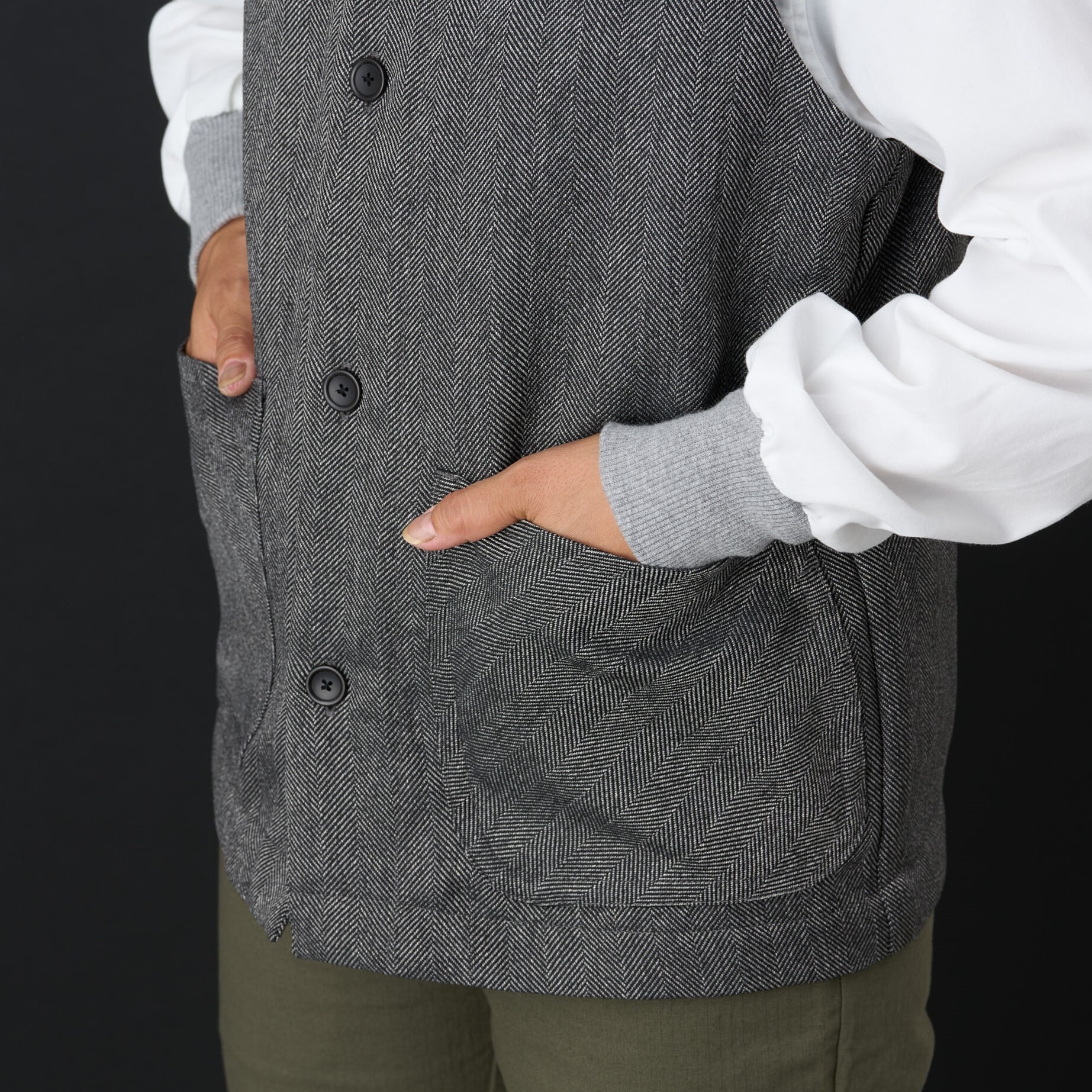 ウールライクなポリエステルのヘリンボーン生地でランバーベストを作りました。