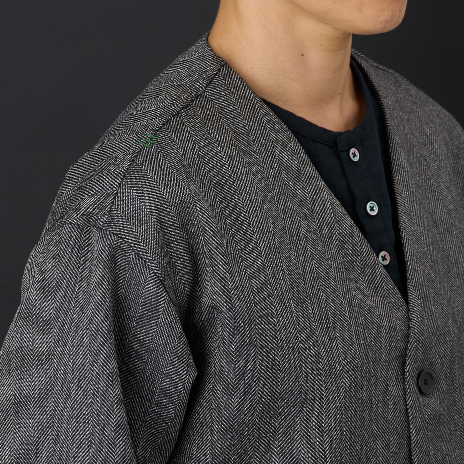 ウールライクなポリエステル100%のヘリンボーン生地でドロップショルダーのカーディガン型を作りました。 第二、第三ボタンは比翼にしてシンプルなデザインに。パッチポケットはバイアスにしてアクセントにしました。