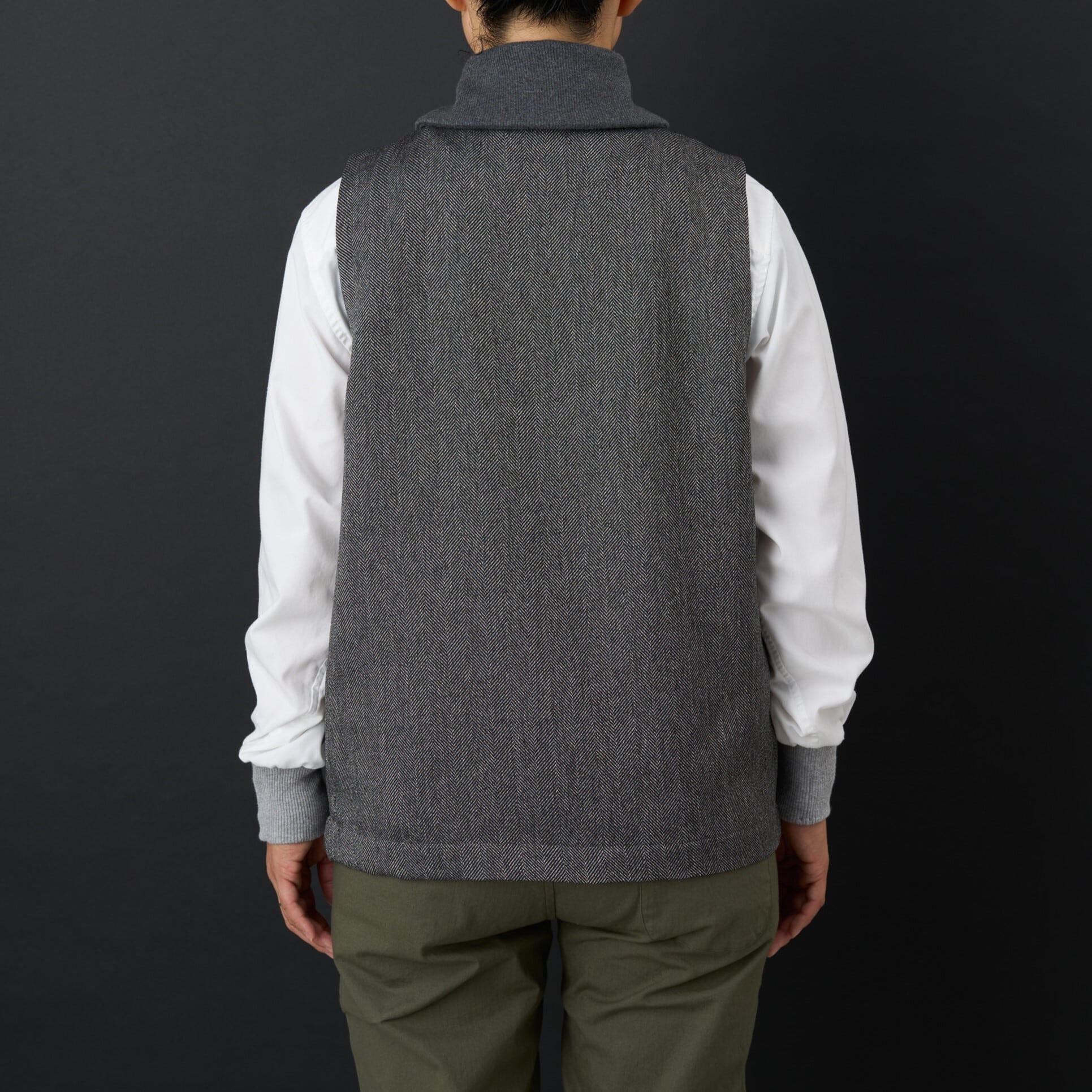 ウールライクなポリエステルのヘリンボーン生地でランバーベストを作りました。