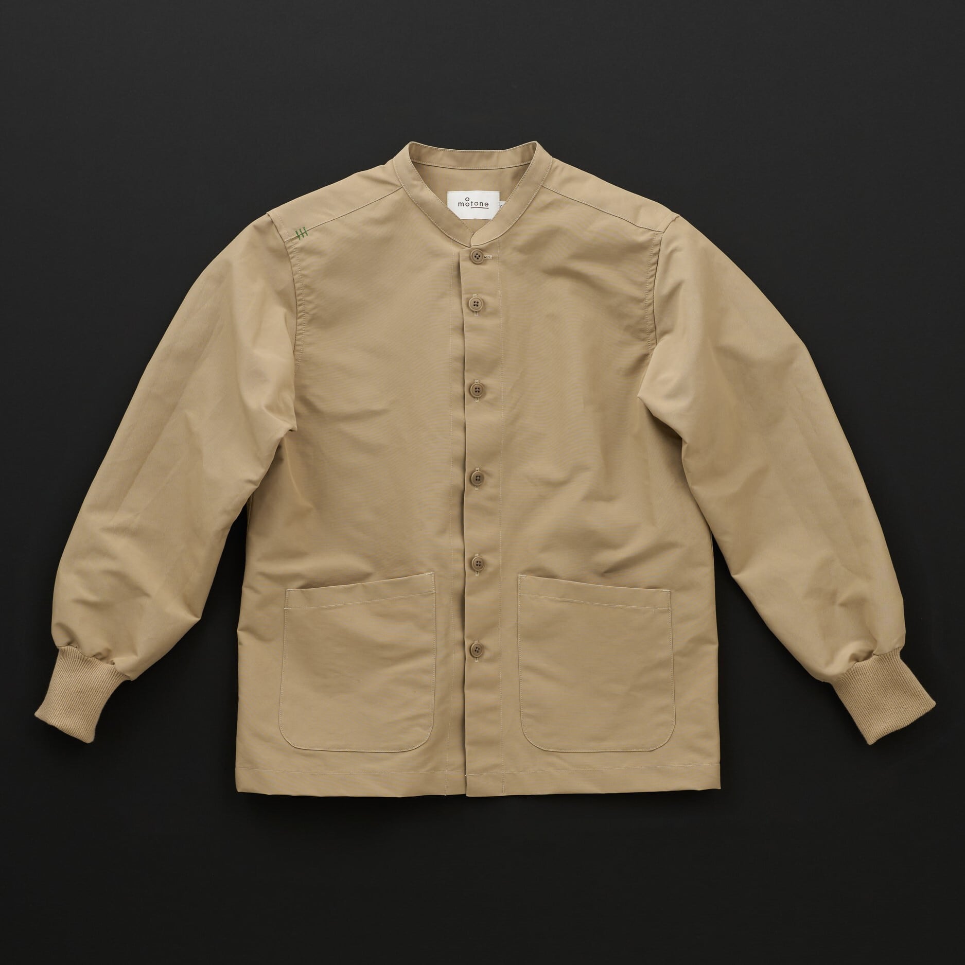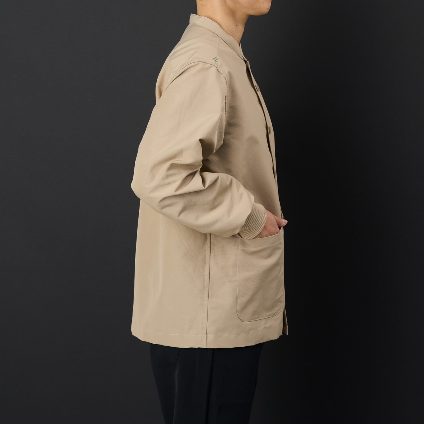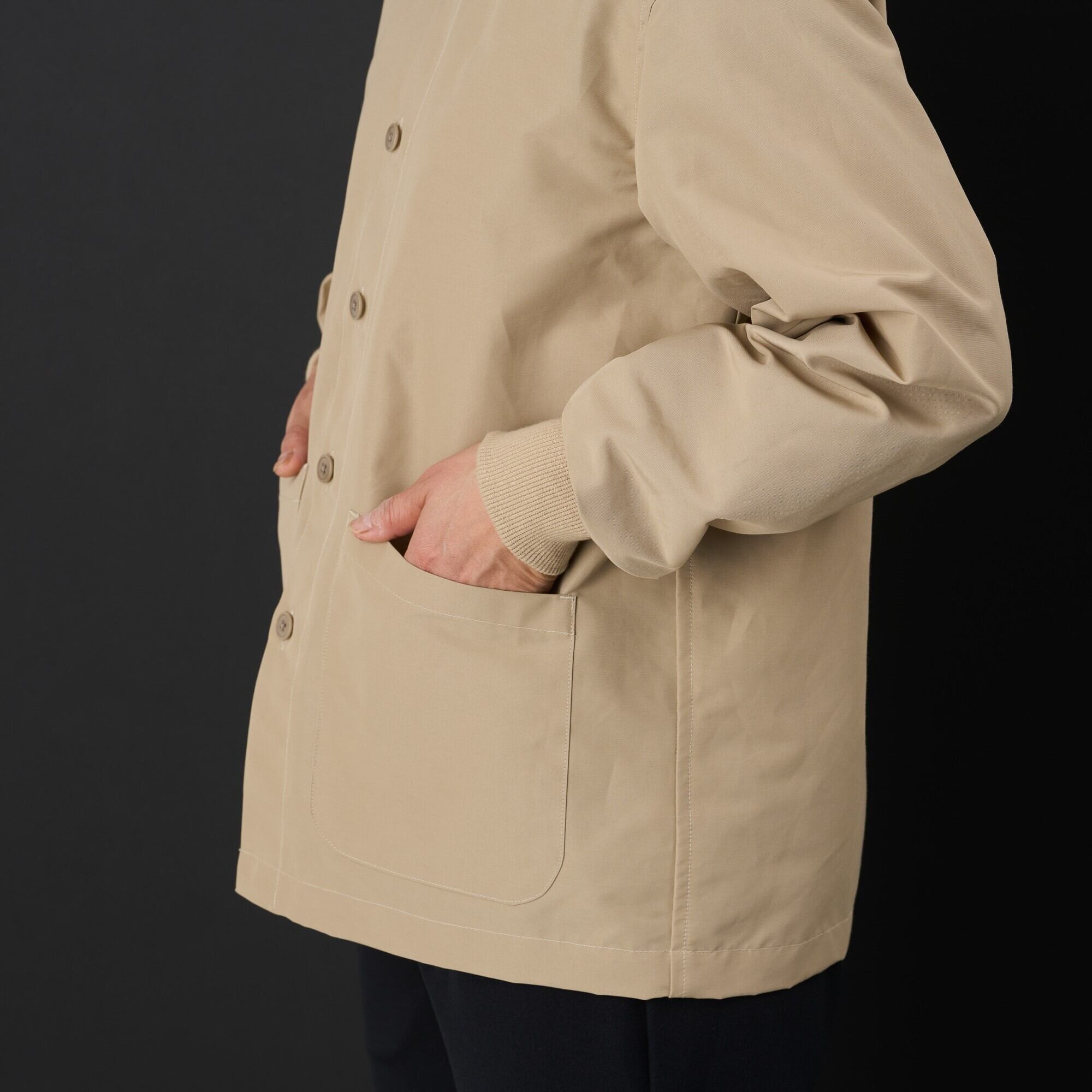 マウンテンパーカーによく使われる軽くて耐久性が高い生地ロクヨン(綿60% ナイロン40%) 弊社では撥水加工を施したロクヨンでシャツジャケットを作りました。羽織としてもお使いください。 シワになりにくいのも特徴です。