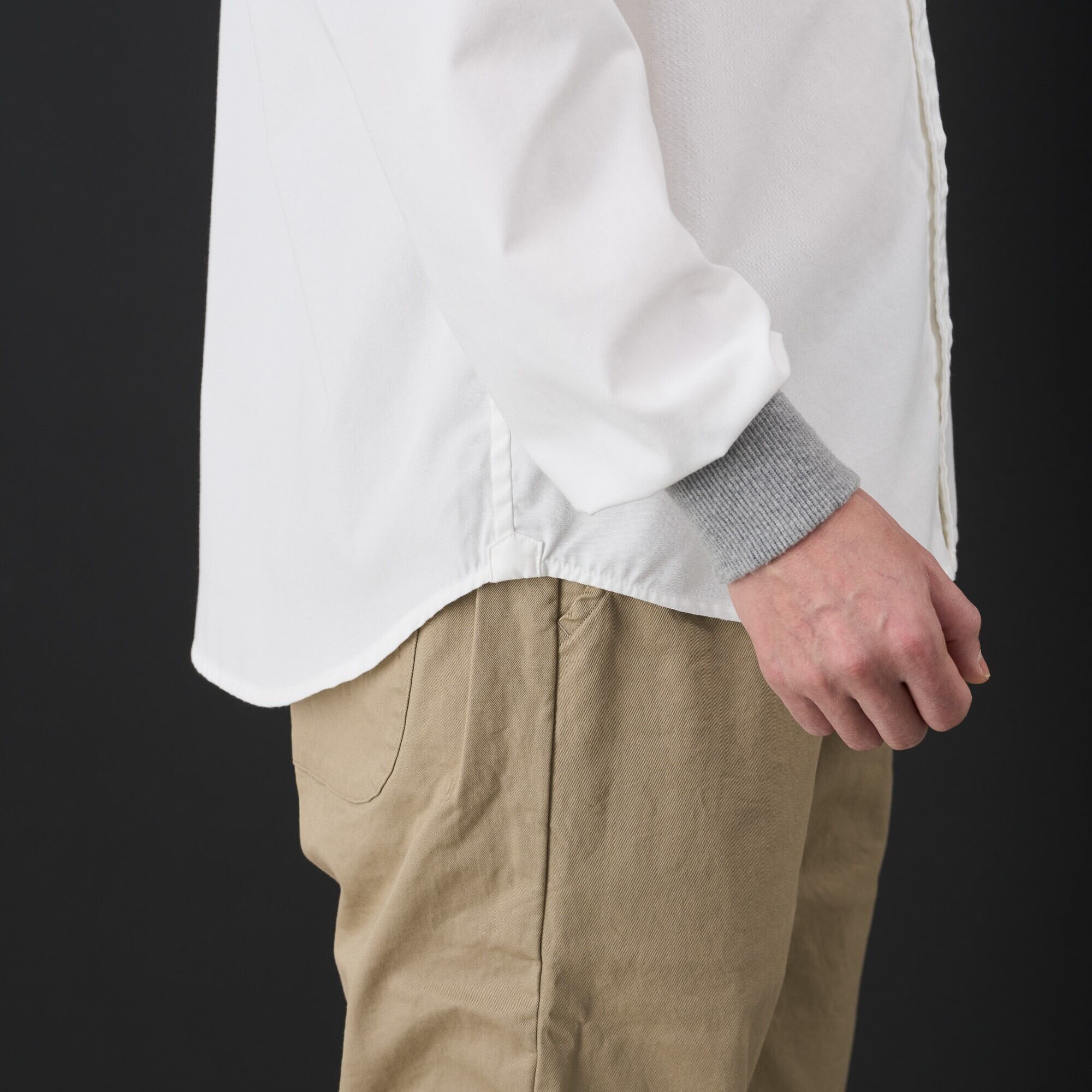 力仕事をする時、洗い物をする時などはもちろん、気分を新たに何かに取り組みたい時に、私たちはシャツのそでを上にあげます。シャツのそでをリブにしたら、簡単にそでを上げ下げできる、着心地のいいシャツができました。本社アトリエできちんと仕立てた、新しい「日常着・ワークシャツ」です。