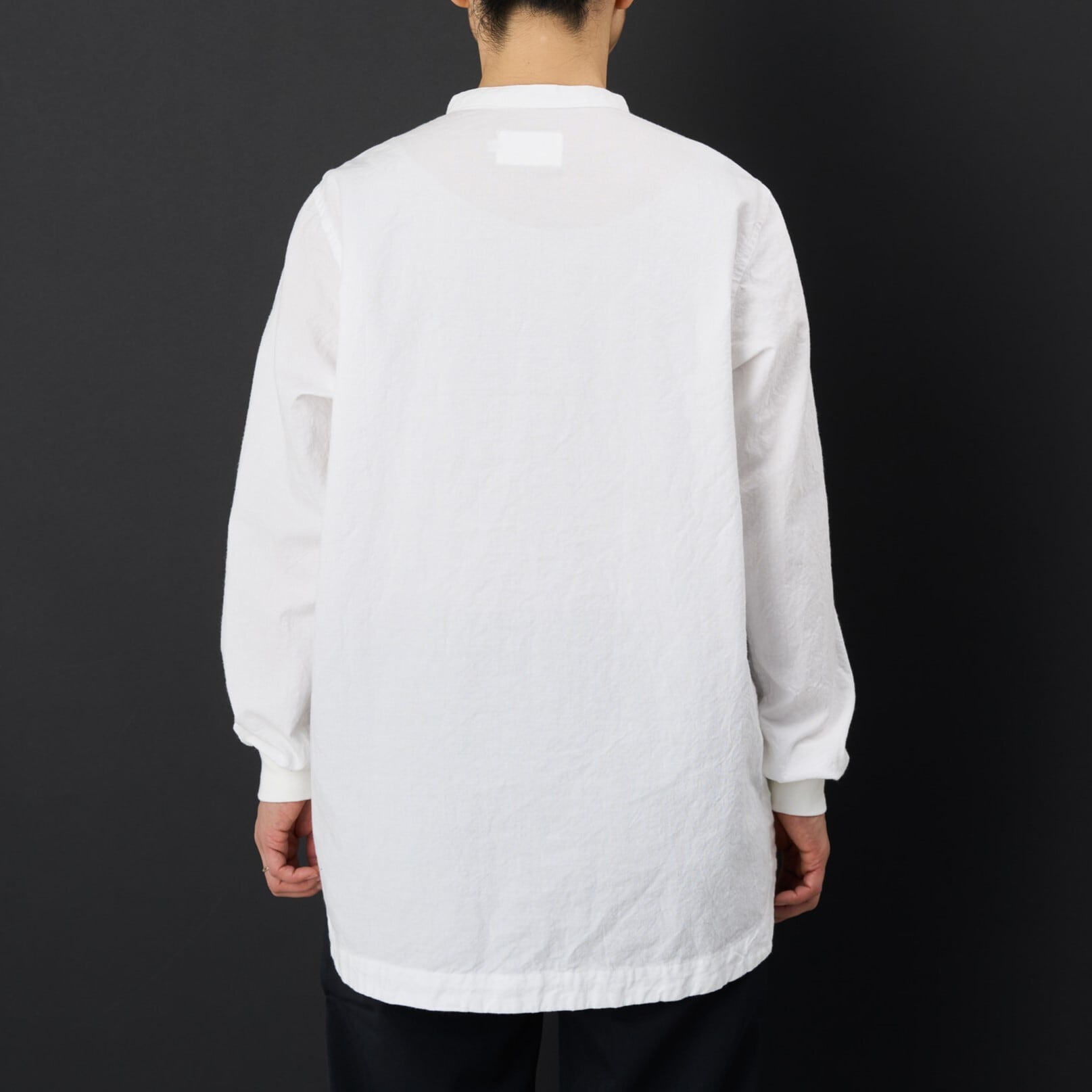 かがんだ時に背中が出ないように後ろ身頃が長い仕様はそのままに出来るだけシンプルにしました。裾脇を開ける仕様にしてパンツのポケットやウエストベルトにつけた物を取りやすくした仕様も特徴です。