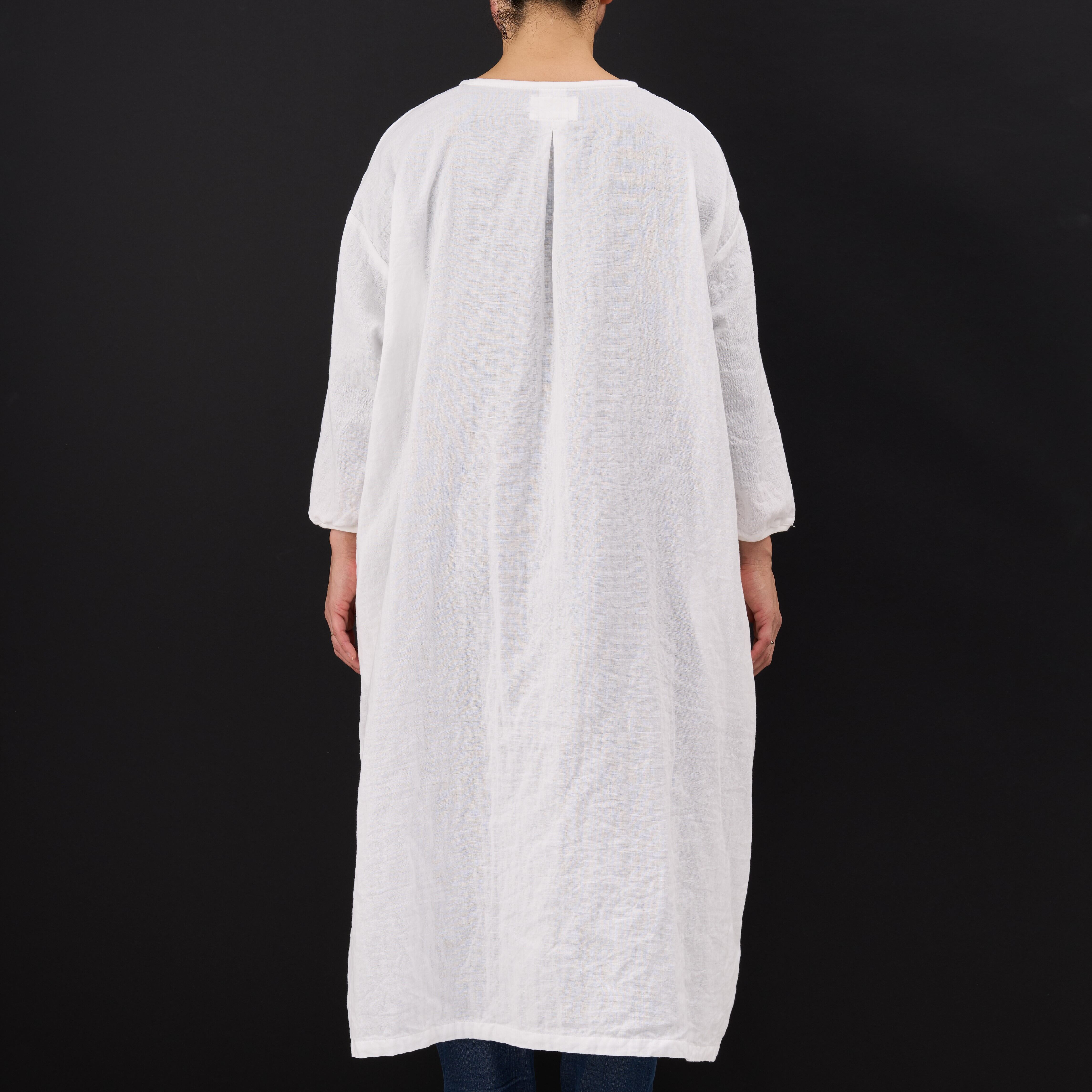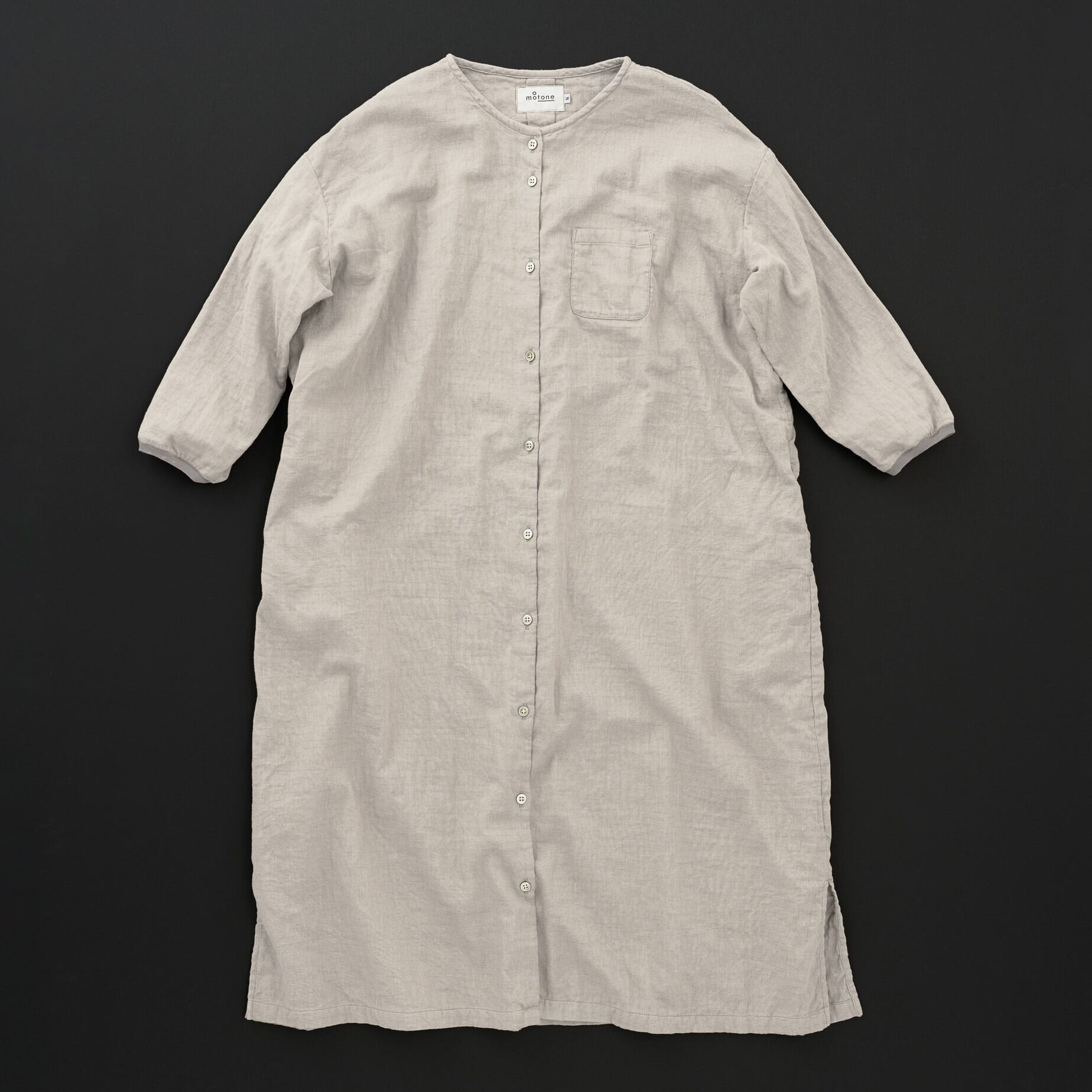 コットン100%のダブルガーゼ生地でノーカラーのワンピース型を作りました。 9分袖で袖口のリブは締め付けないように工夫しました。 前開きのワンピースですので羽織としてもご使用いただけます。