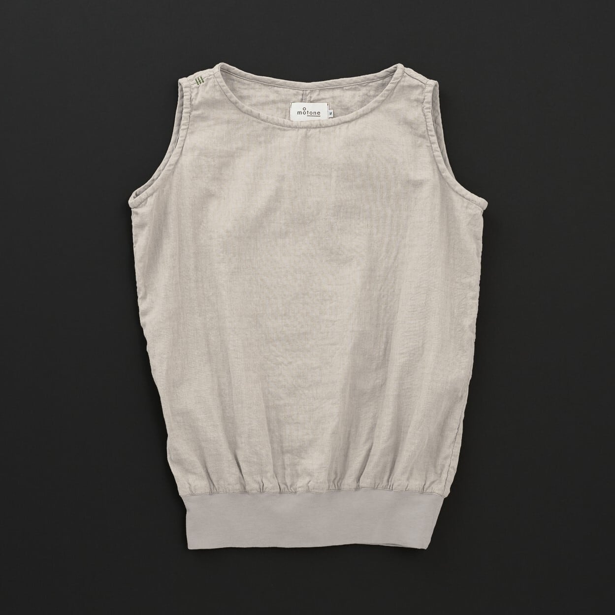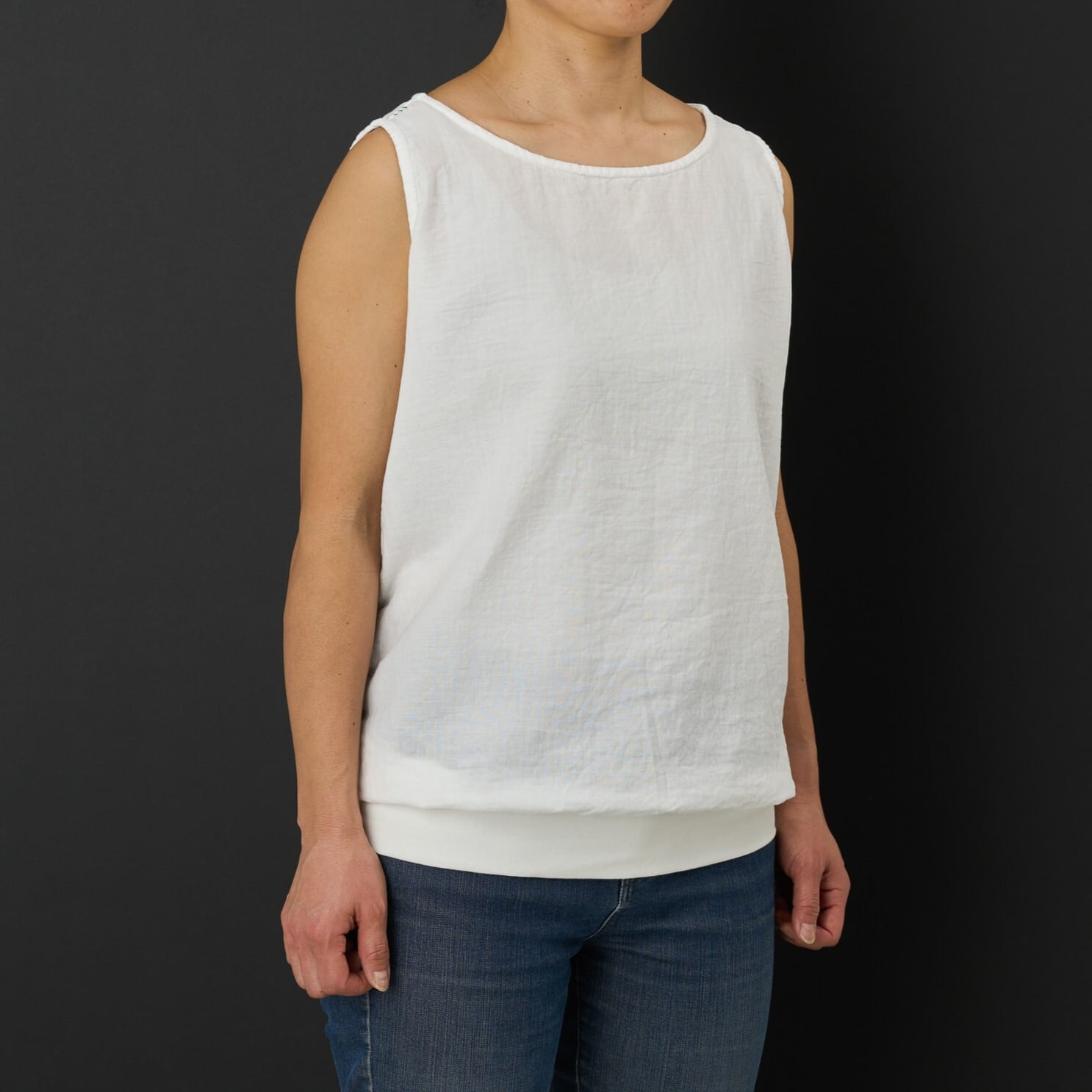 コットン100%のダブルガーゼ生地でタンクトップ型を作りました。 衿ぐりはボートネック、肩は広めのデザインで裾リブが特徴のタンクトップです。