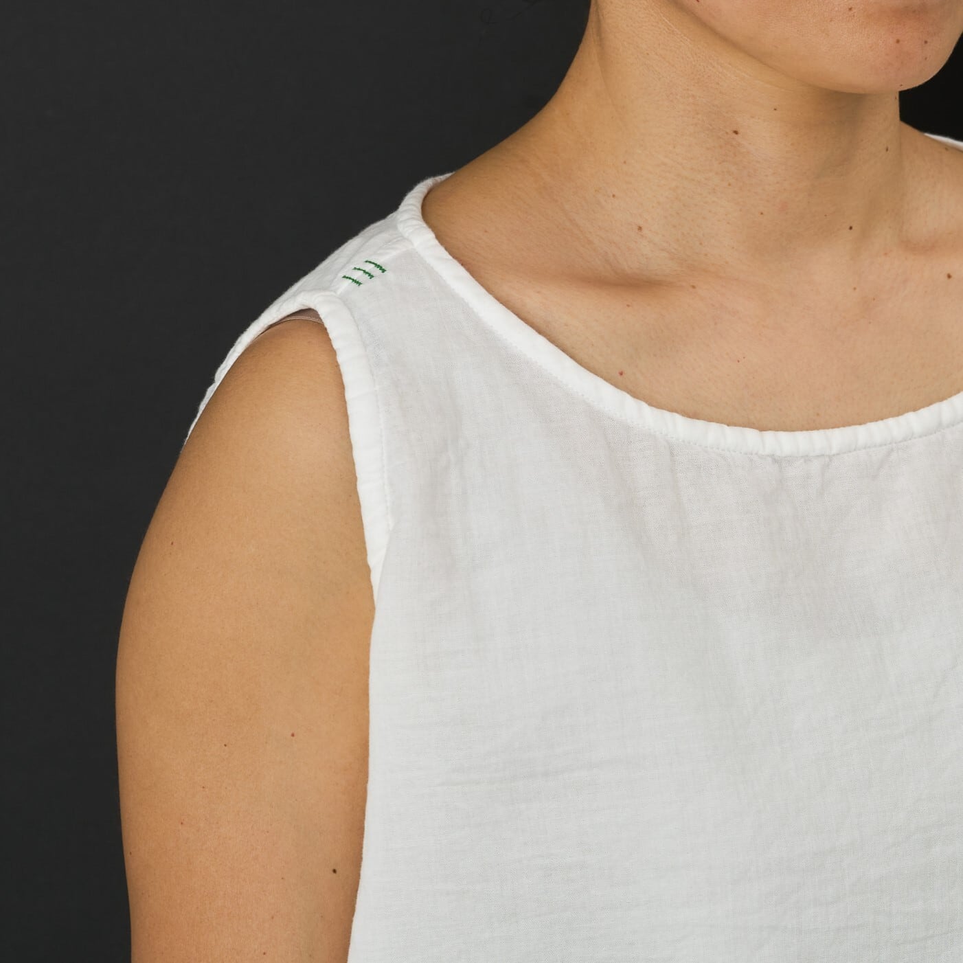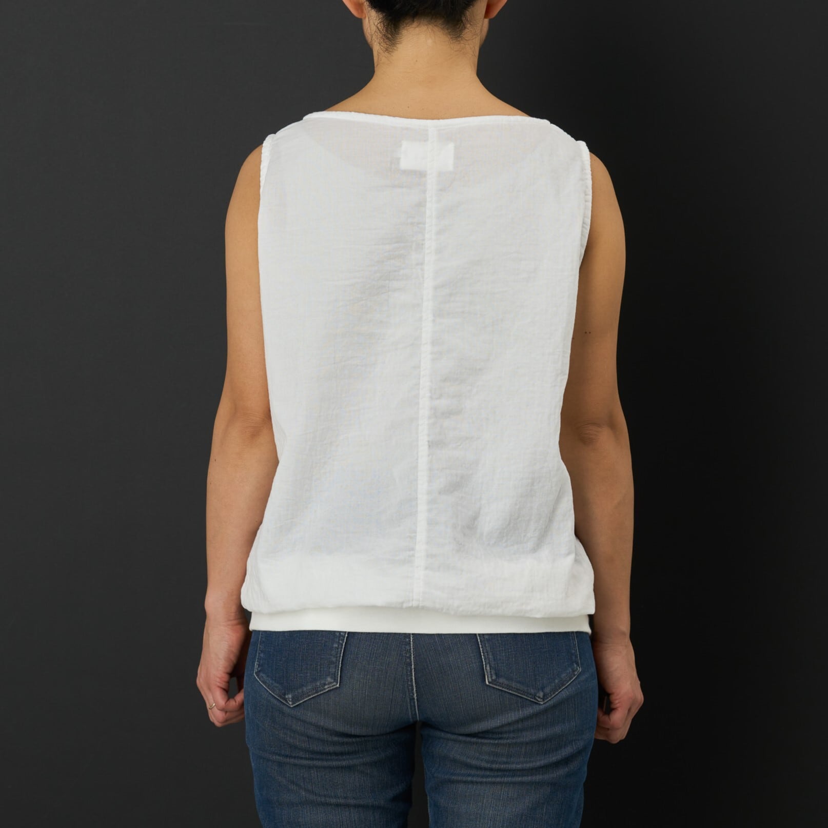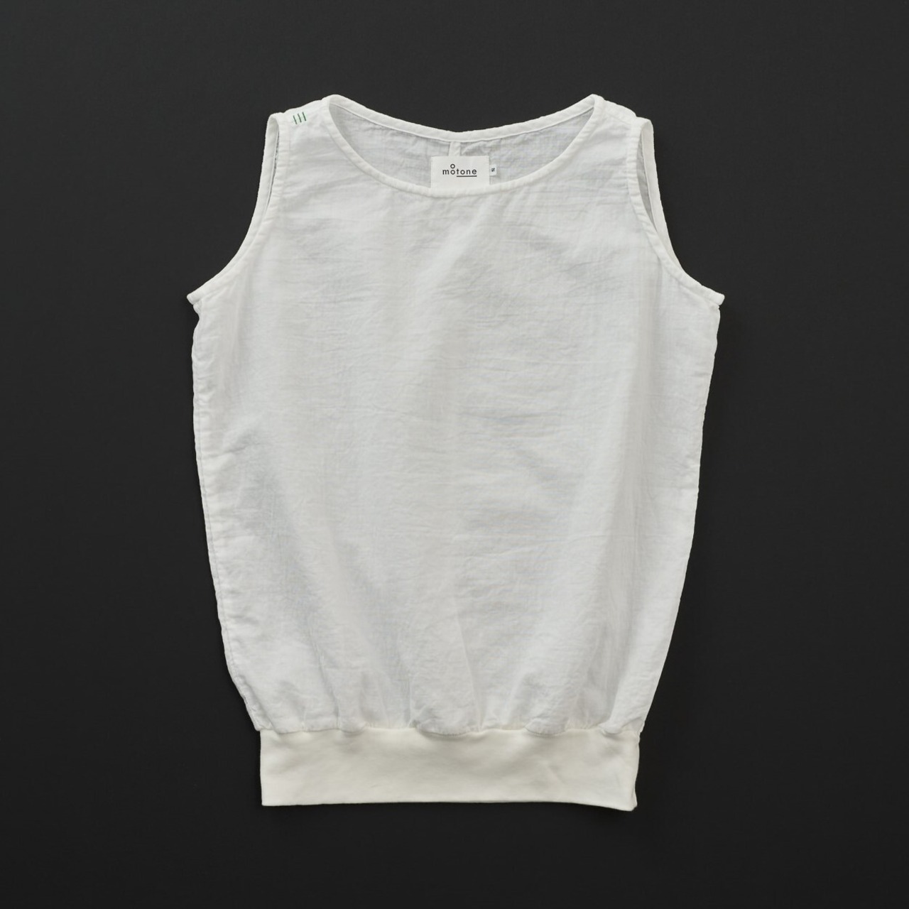 コットン100%のダブルガーゼ生地でタンクトップ型を作りました。 衿ぐりはボートネック、肩は広めのデザインで裾リブが特徴のタンクトップです。