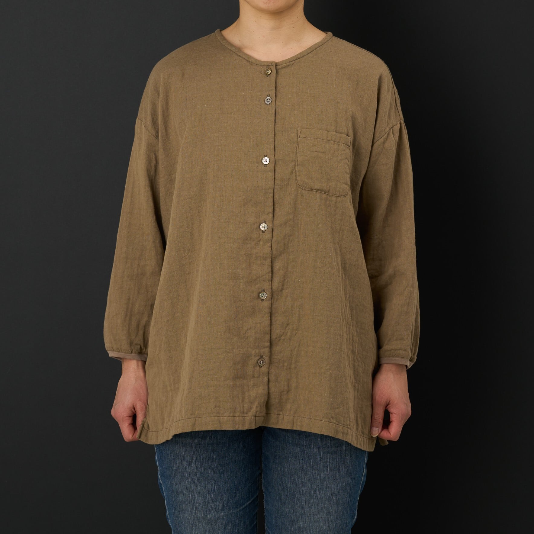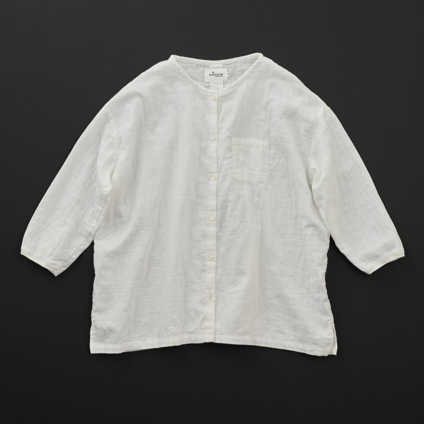コットン100%のダブルガーゼ生地でノーカラーのシャツ型を作りました。 9分袖で袖口のリブは締め付けないように工夫しました。 前開きのシャツですので羽織としてもご使用いただけます。