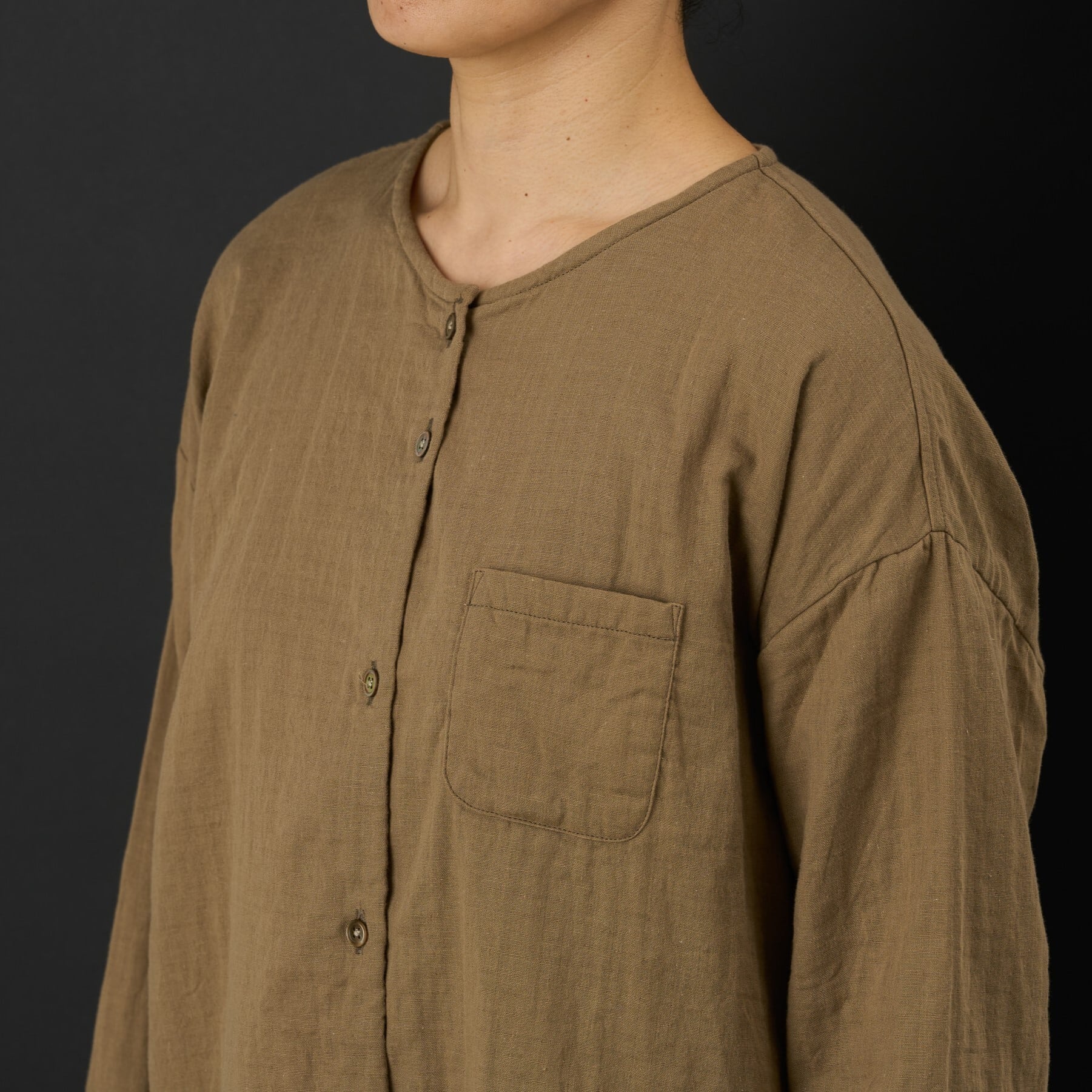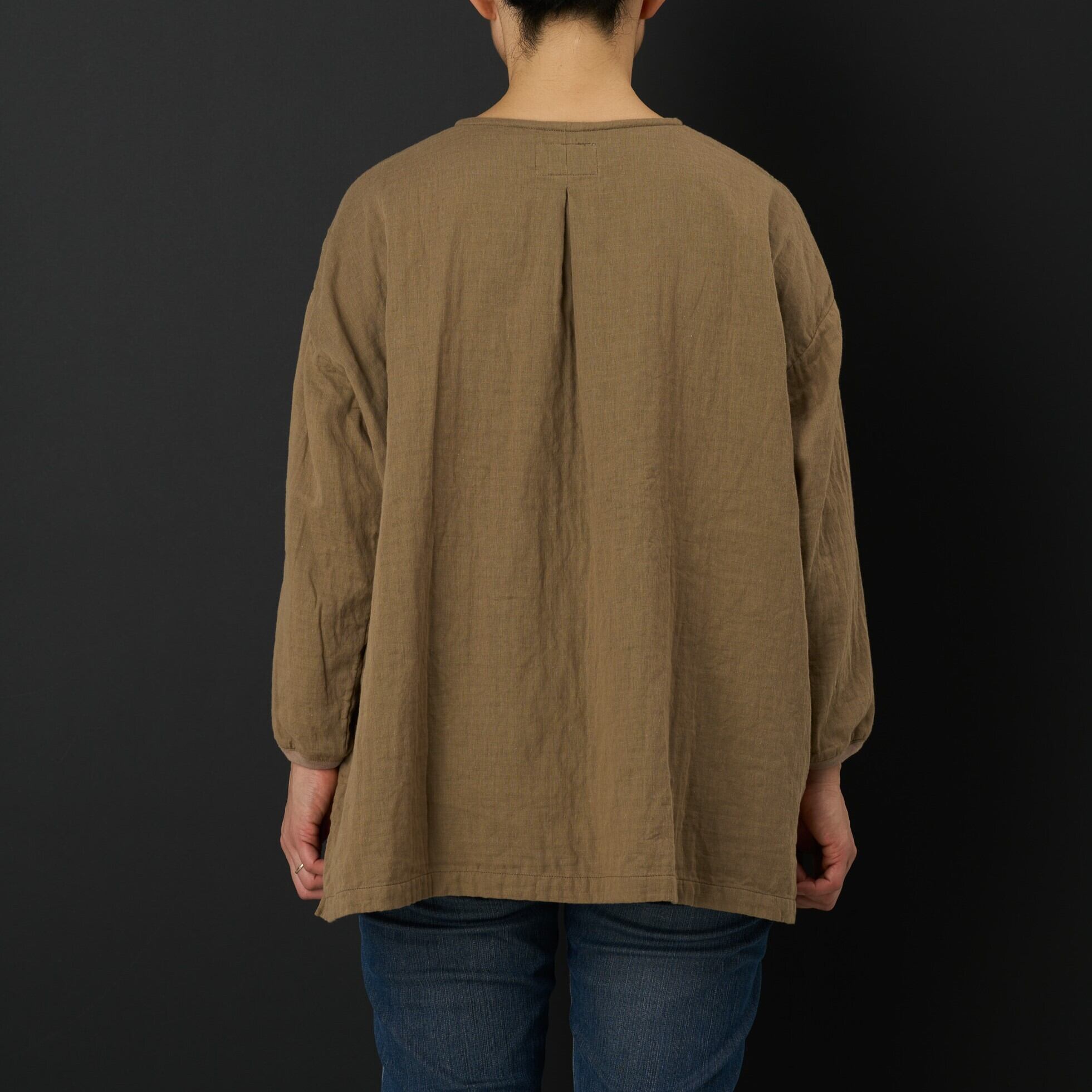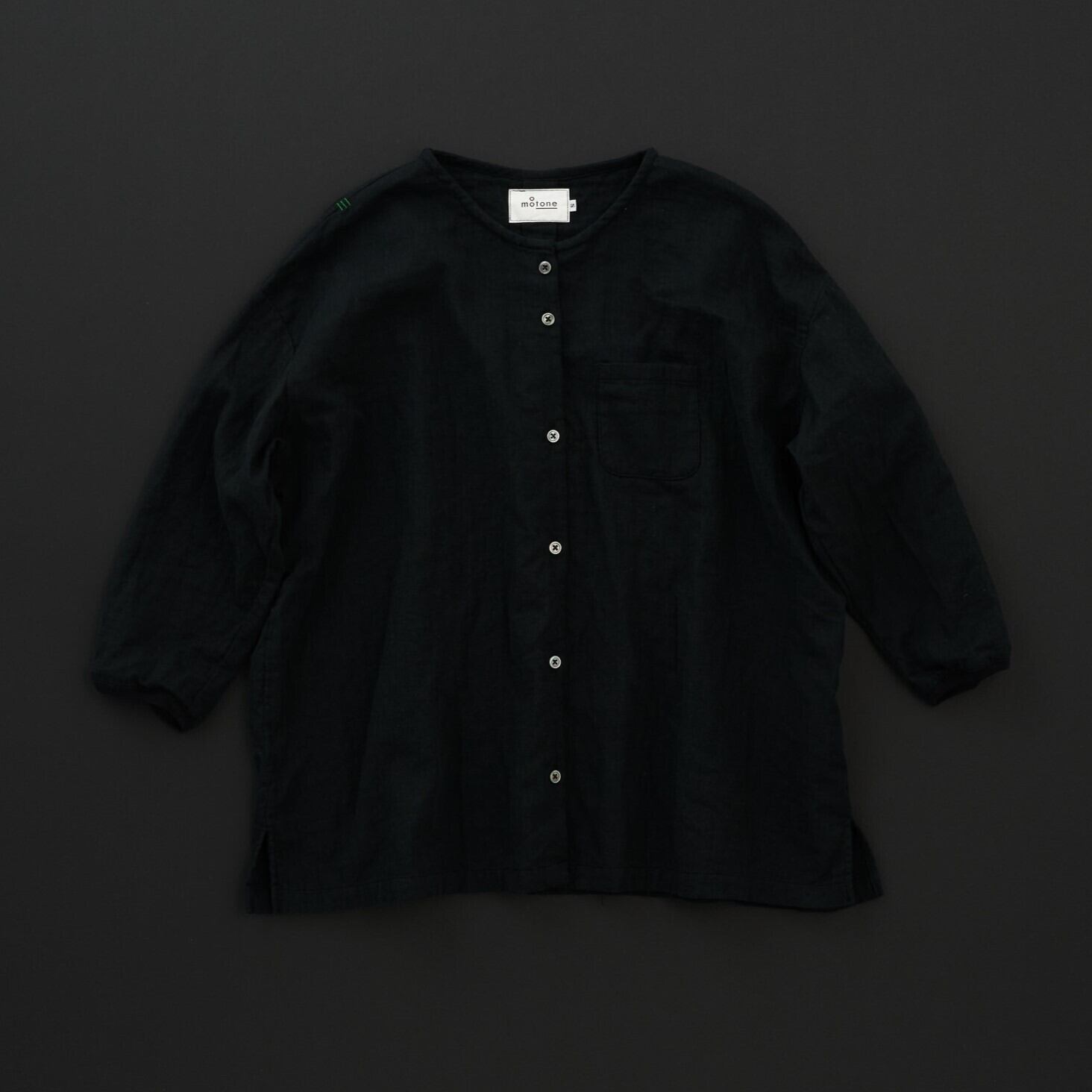 コットン100%のダブルガーゼ生地でノーカラーのシャツ型を作りました。 9分袖で袖口のリブは締め付けないように工夫しました。 前開きのシャツですので羽織としてもご使用いただけます。