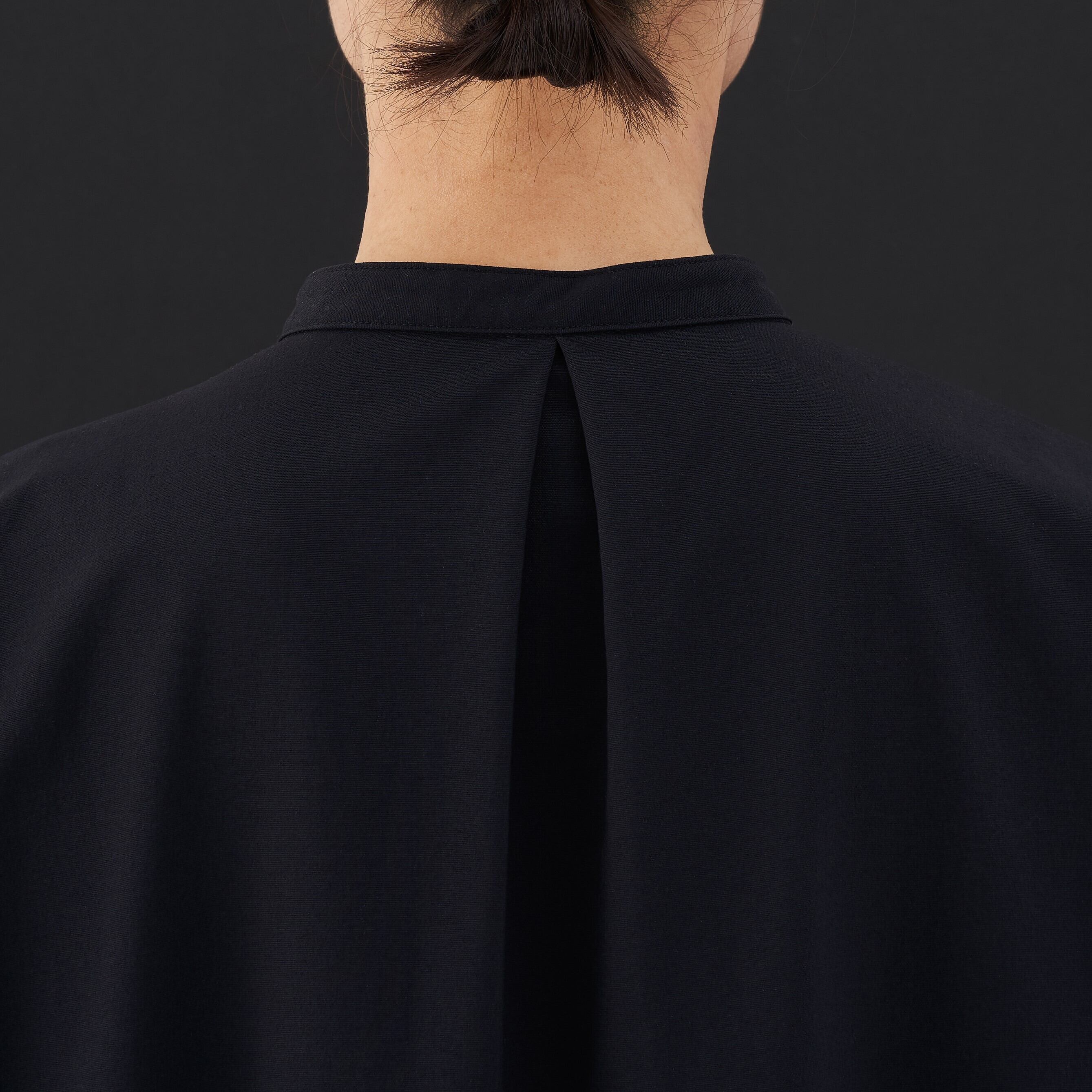 コットンナイロンストレッチ生地のドロップショルダー型ワンピース。