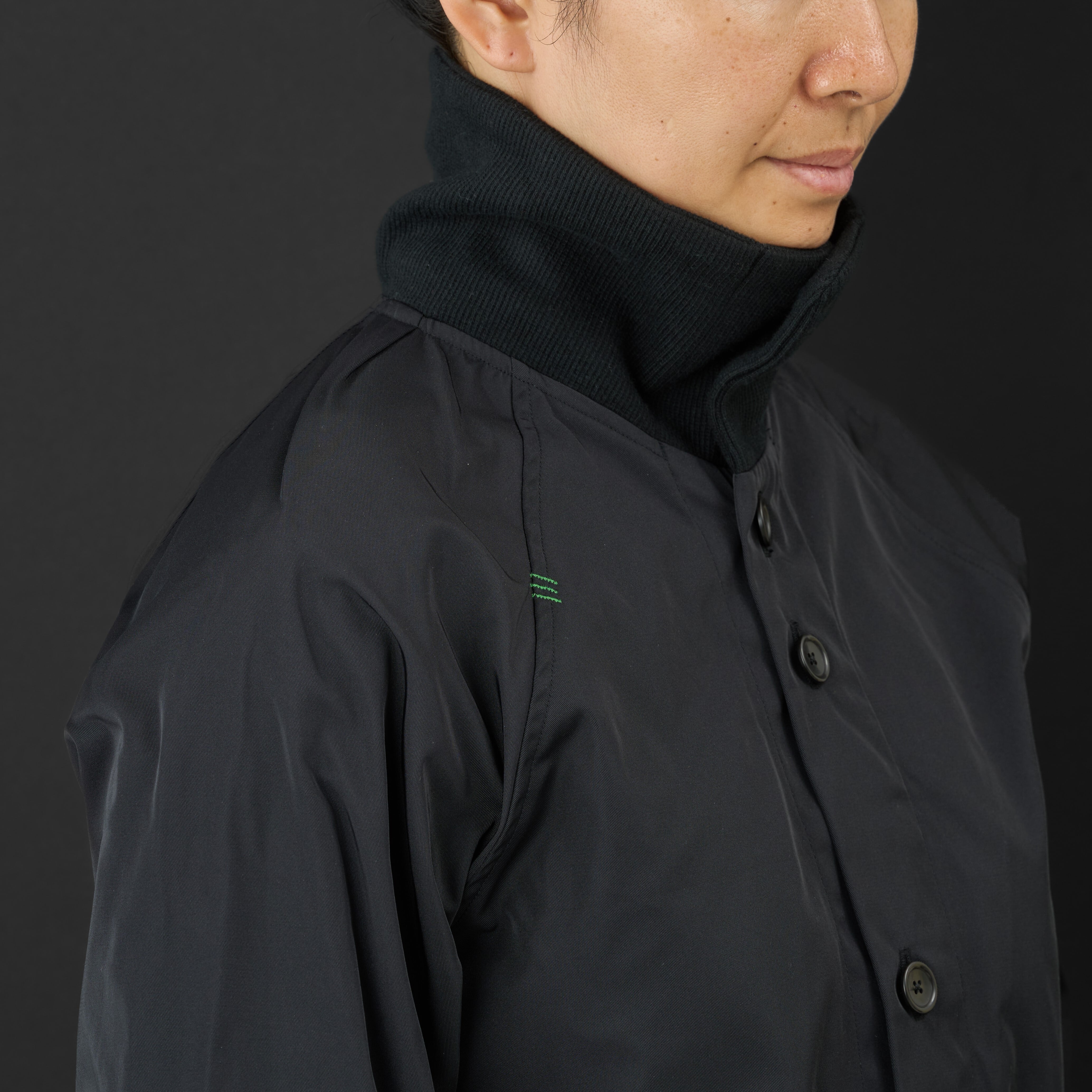 コニファー(針葉樹)をイメージしてAラインのミドル丈のジャケットを作りました。襟のボタンをとめてハイネックにしたり、とめずに開いたり、さまざまな着こなしをお楽しみください。生地は打ち込みが強いポリエステル生地で軽くて丈夫な生地です。形状記憶ですのでシワになりにくいのも特徴です。旅行や出張の時には丸めてリュックなどに入れて持ち運べるとても便利なアイテムです。インナーに薄いダウンジャケットなどと合わせて頂くと寒い時期も着ていただけます。