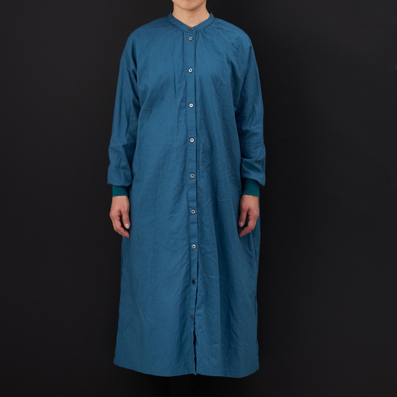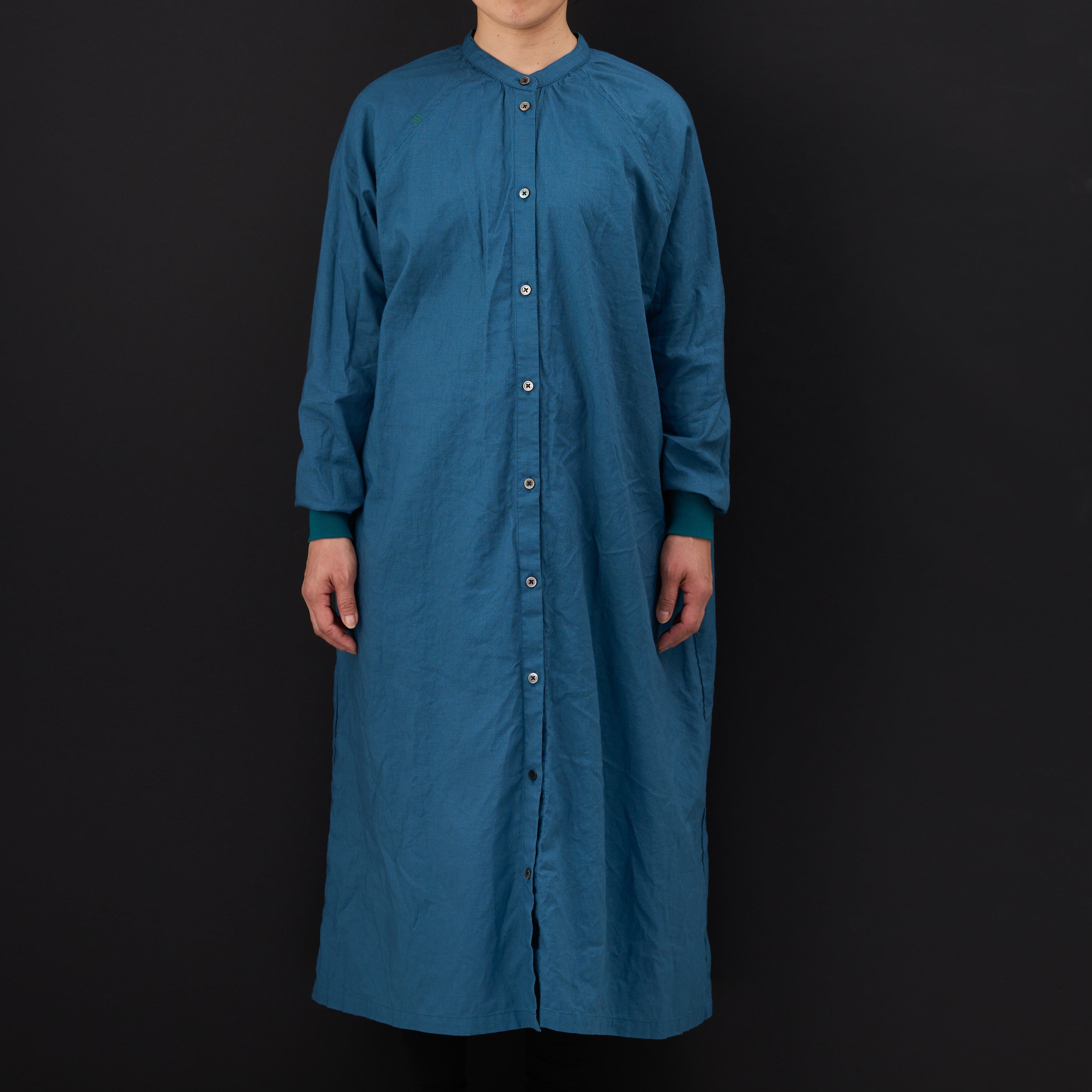 20S綿麻生地(ノーカラーシャツ 半袖 / ノーカラーワンピース 半袖 同生地)で衿ぐりギャザー・ラグラン袖のワンピースをつくりました。前開きのワンピースですので羽織としてもご使用いただけます。